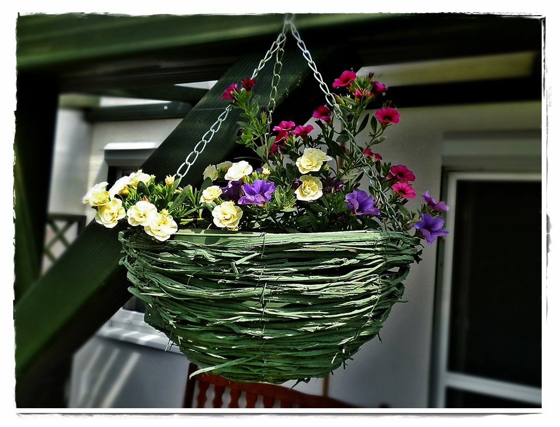 Az idő vasfoga mindent kikezd. 3 éve vesszőkosarakat vásároltam a teraszra kihelyezendő virágoknak. A natúr vessző fonatot a nap, eső, a használat, meg a téli tárolás elcsúfította. Tavasszal a balkon növények kihelyezésekor nem tetszett a kosarak megjelenése. Az állapota hibátlan volt. Találtunk egy időtálló, olcsó és tetszetős megoldást. Lábazat festék. Háztartási (1kg) kiszerelésben is kapható. Színválaszték is bőven van belőle. Nekünk a zöld passzolt a környezethez. A bele helyezendő virágtálakat (ezek barna műanyagok) is megfestettük, mert átvilágított a kosáron a barna szín. A műanyagra is jól fogott a festék.